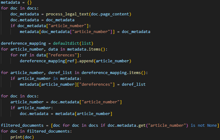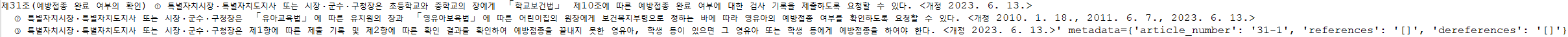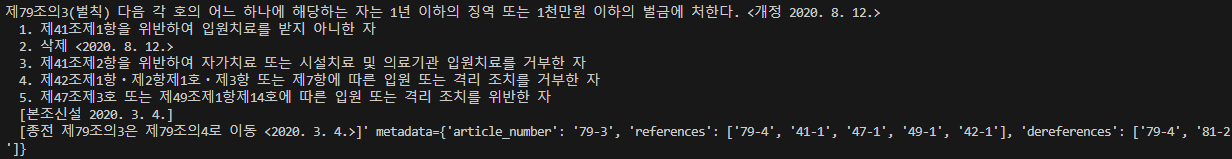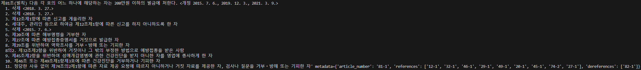 따라서 이를 해결하기 위해 현재 시행중인 법령인지를 검사하는 함수를 만들어주고, 메타데이터를 생성해주는 과정에서 현재 시행중인 법령이 아닌 경우에 해당 조항을 건너뛰게끔 구현함으로써 해결해주었다.