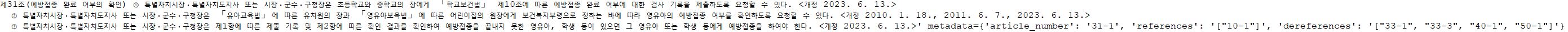 제31조(예방접종 완료 여부의 확인) ① 특별자치시장ㆍ특별자치도지사 또는 시장ㆍ군수ㆍ구청장은 초등학교와 중학교의 장에게 「학교보건법」 제10조에 따른 예방접종 완료 여부에 대한 검사 기록을 제출하도록 요청할 수 있다. <개정 2023. 6. 13.>