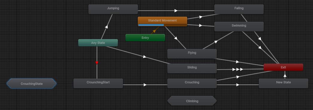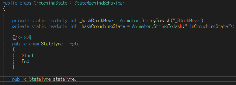 그리고 CrouchingState 라고 명시된 Sub-State를 보면 AnyState에서 CrouchingStart로 연결되게 구현해두었는데, 이렇게 되면 Can Transition To Self 가 해제되어 있더라도 Crouching 으로 상태가 넘어가는 순간 다시 CouchingStart로 넘어가기 때문에 StateMachineBehaviour 를 사용해서 Sub-State 안에 있는 경우 AnyState에서 넘어오는 것을 방지하게끔 구현해두었다.