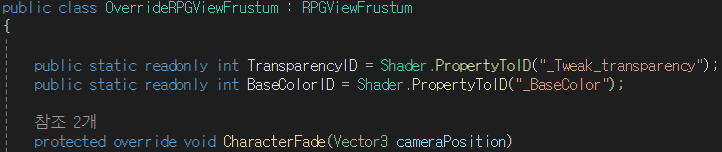결론은 사용하고 있는 에셋의 RPGViewFrustum 클래스를 상속하여 캐릭터를 투명화하는 클래스를 상속받아 재정의하여 해결하였다.