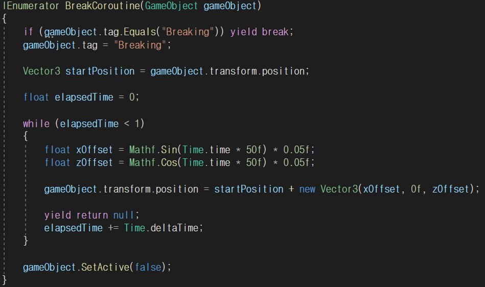 그리고 1초동안 충분히 흔들리게 하였다면 비로소 게임 오브젝트를 비활성화 해줌으로써 실행이 끝난다.