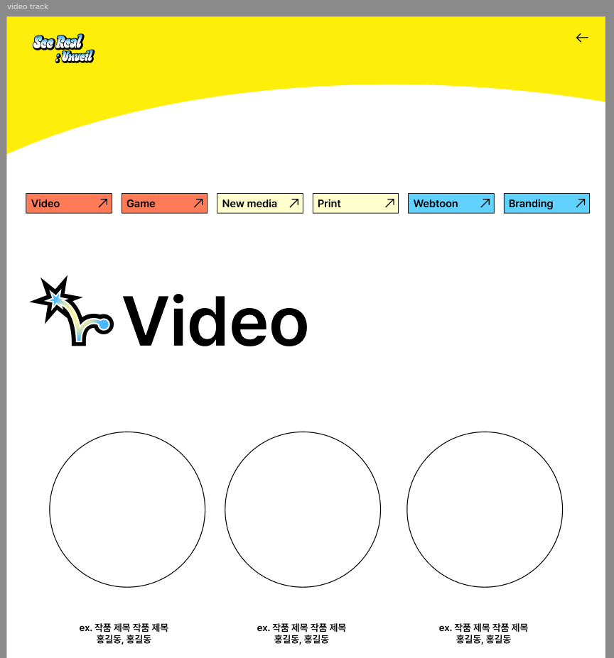 Video, Game, New media, Print, Webtoon, Branding 등 분야별로 작품을 모아서 보여주는 페이지다.
