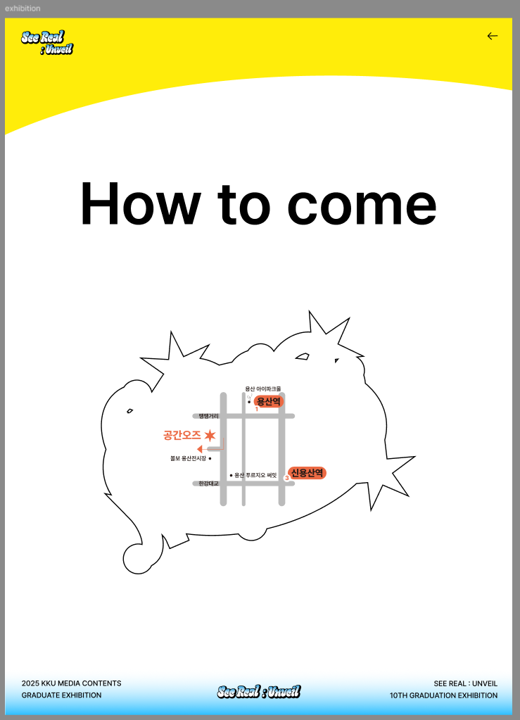 | 전시회 위치를 안내해주는 페이지 | 초대장 페이지도 있다. 초대장은 별도의 팝업 형태로 띄우길 원한다고 했다. |