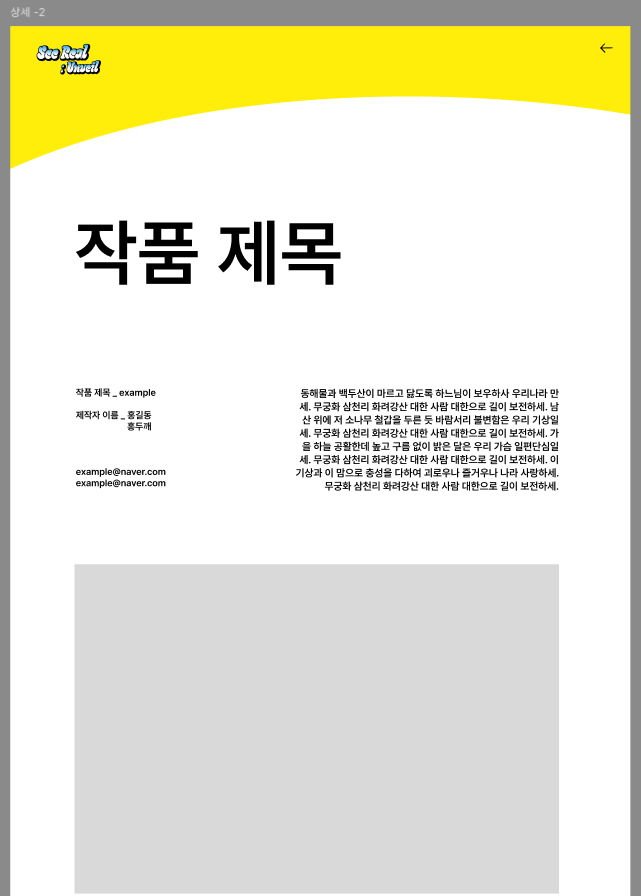 | 작품 제목, 작가 이름과 연락처, 작품 설명, 작품 이미지가 들어간다. | 작가 상세 페이지도 작가 이름과 연락처, 작품 사진이 있다. 여기서 작품 사진을 누르면 좌측의 작품 상세 페이지로 이동되도록 구성되어 있다. |